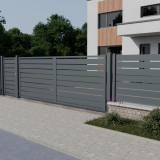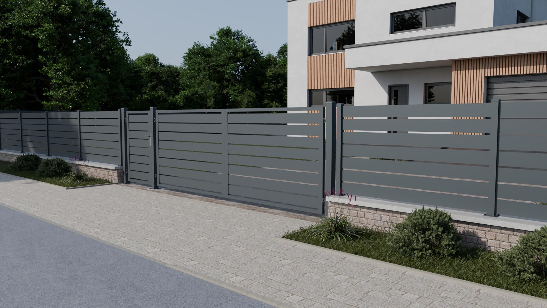 Prednú časť pozemku riešte ako pohľadové oplotenie – nižší plot (925 mm alebo 1200 mm), ktorý pôsobí esteticky a nebráni výhľadu. Vhodné sú hliníkové lamely s dištančnými lištami (vzdušný efekt) alebo WPC pre plnší vzhľad.