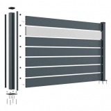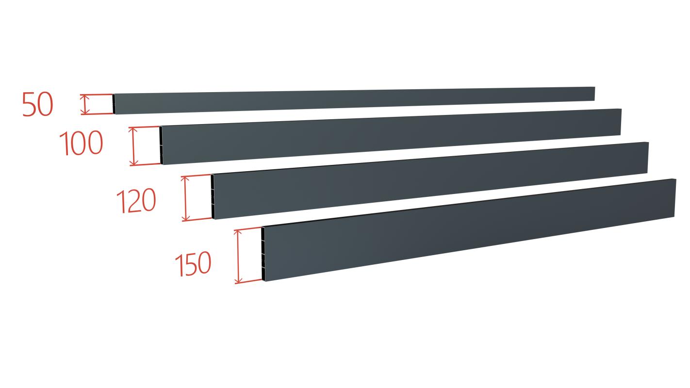 Dištančné lišty 10/20/50 mm – dávajú sa jednotne alebo v kombinácii (napr. 2×50 mm + 1×20 mm) podľa požadovaného vzhľadu a súkromia. Pre iné rozmery použite kryciu lištu skrátenú na požadovaný rozmer.