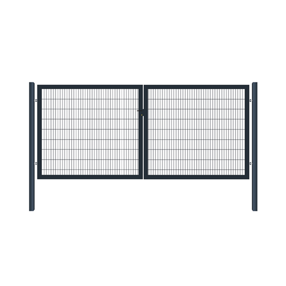 Výplň bránky zváraná sieť. Rozmer oka 50x200mm. Priemer drôtu 5mm. Nastaviteľné pánty. Jaklový profil 80x80mm (stĺp), 40x40mm (rám). Povrchová úprava: zinok + RAL 7016 antracit.