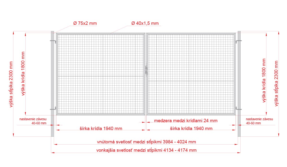 Výplň brány je zváraná sieť. Veľkosť oka 50x50mm. Priemer drôtu D 4mm. Priemer stĺpikov D 75mm. Výška stĺpikov 2300mm.Hrúbka steny stĺpikov 2,0mm. Povrchová úprava: zinok + RAL6005 zelená. Súčasťou balenia je aj zámkova časť a kľučka.