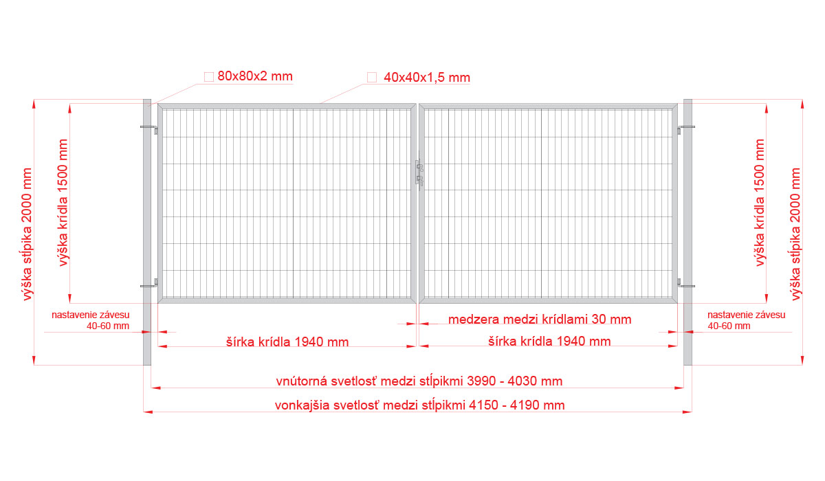 Z našej ponuky si môžete vybrať farebné varianty: zelená RAL6005 a antracit RAL7016. Brány ponúkame vo výške 1500 mm, 1800 mm a 2000 mm. Šírka brány je 4000 mm. Pred inštaláciou brány si prosím skontrolujte prechodové a osové rozmery, ktoré sa môžu líšiť v závislosti od typu krídla, závesov a zámkovej časti. Súčasťou brány je aj kompletná zámková časť, kľučka, cylinder s kľúčmi, doraz, zástrč brány a pánty.