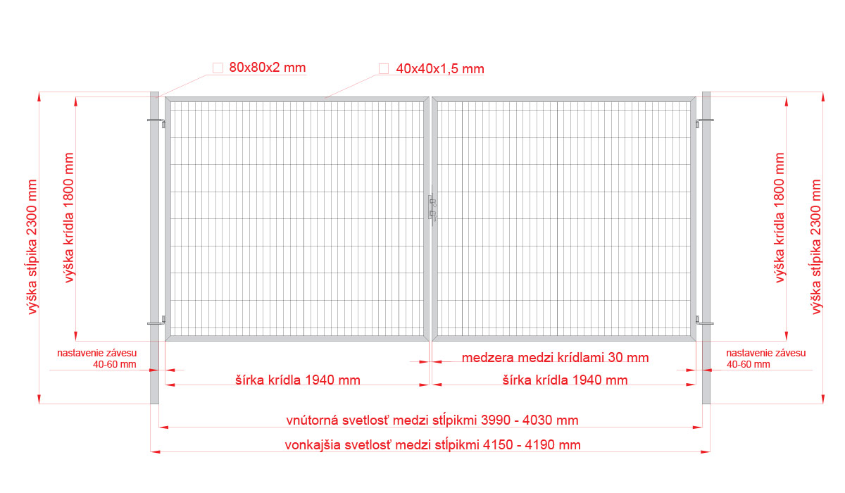 Výplň brány zváraná sieť.Rozmer oka 200x50mm.Priemer drôtu 4mm. Profil stĺpikov 80x80x2mm.Výška stĺpikov 2300mm.Profil rámu 40x40x1,5mm.Povrchová úprava: ZN+RAL6005 zelená.Súčasťou balenia je zámkova časť, kľučka, zástrč a stredový doraz.