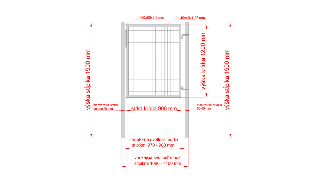 Pred inštaláciou bránky si prosím skontrolujte prechodové a osové rozmery, ktoré sa môžu líšiť v závislosti od typu krídla, závesov a zámkovej časti. Súčasťou bránky je aj kompletná zámková časť, kľučka, cylinder s kľúčmi, doraz a pánty.