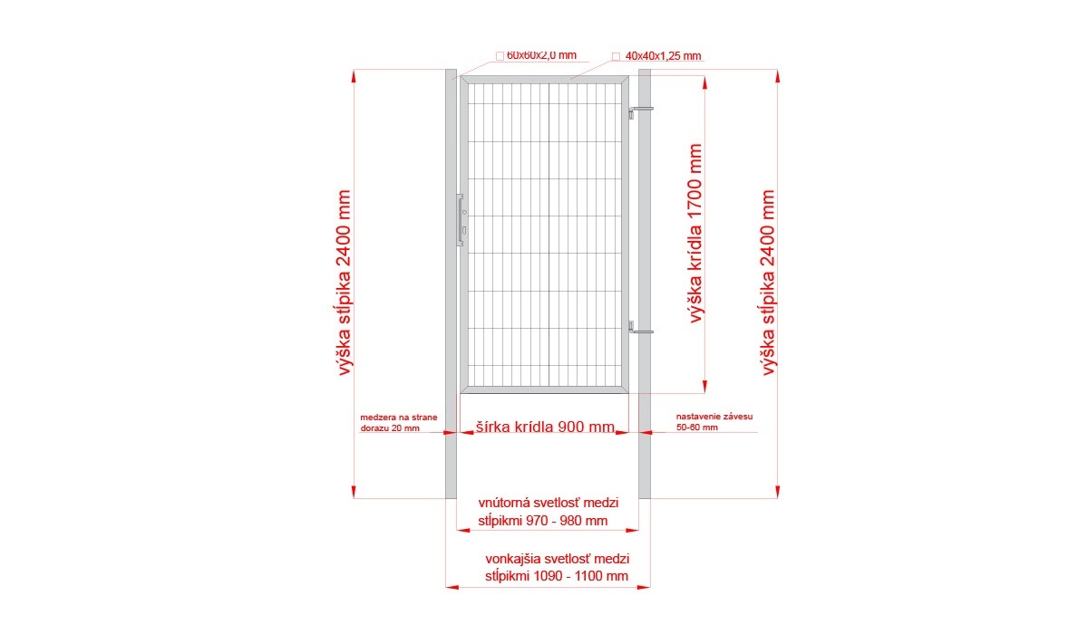 Pred inštaláciou bránky si prosím skontrolujte prechodové a osové rozmery, ktoré sa môžu líšiť v závislosti od typu krídla, závesov a zámkovej časti. Súčasťou bránky je aj kompletná zámková časť, kľučka, cylinder s kľúčmi, doraz a pánty.