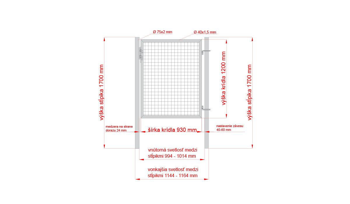Pred inštaláciou bránky si prosím skontrolujte prechodové a osové rozmery, ktoré sa môžu líšiť v závislosti od typu krídla, závesov a zámkovej časti. Súčasťou bránky je aj kompletná zámková časť, kľučka, cylinder s kľúčmi, doraz a nerezové pánty.