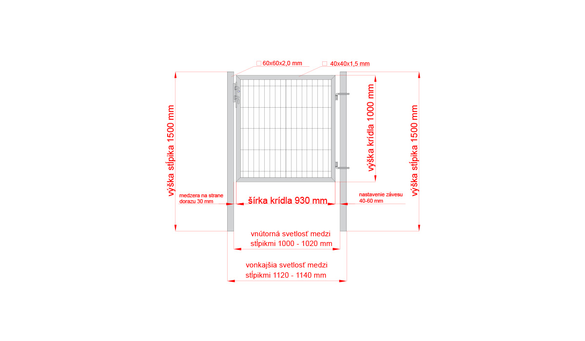 Pred inštaláciou bránky si prosím skontrolujte prechodové a osové rozmery, ktoré sa môžu líšiť v závislosti od typu krídla, závesov a zámkovej časti. Súčasťou bránky je aj kompletná zámková časť, kľučka, cylinder s kľúčmi, doraz a pánty.