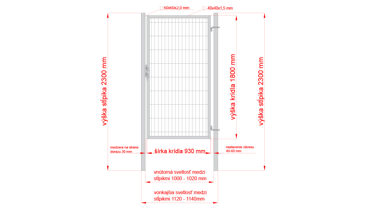 Pred inštaláciou bránky si prosím skontrolujte prechodové a osové rozmery, ktoré sa môžu líšiť v závislosti od typu krídla, závesov a zámkovej časti. Súčasťou bránky je aj kompletná zámková časť, kľučka, cylinder s kľúčmi, doraz a pánty.