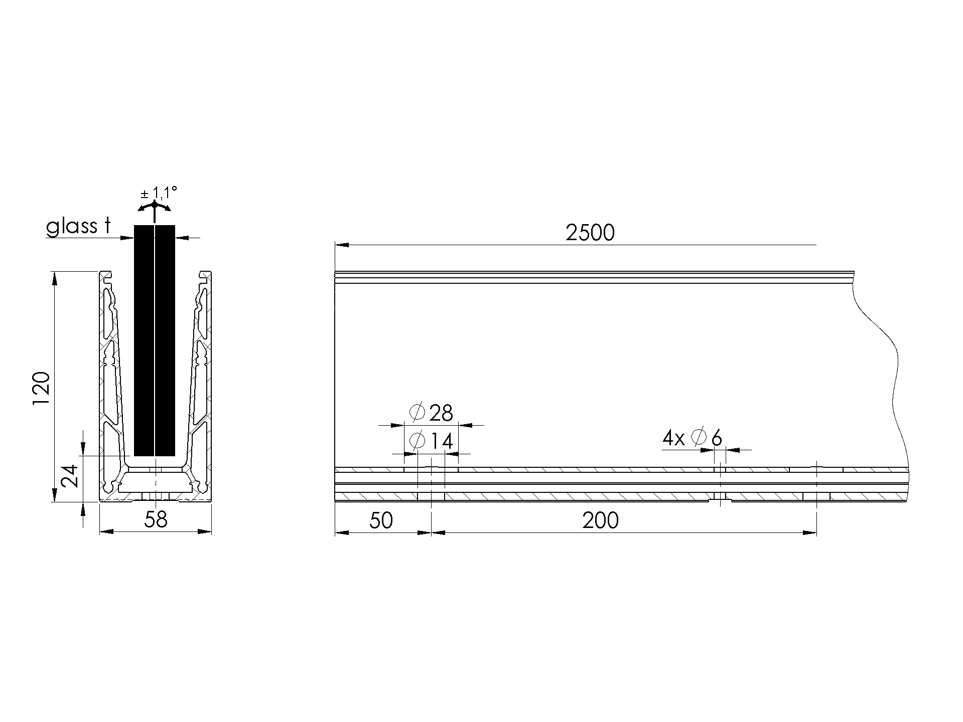 Al. kotviaci profil ELOX 120/57mm pre sklo T=12 až 17,52mm, kotvenie z vrchu do podlahy, nastaviteľný sklon skla. Dodávané v dĺžkach L2500mm (13ks otvorov d14mm pre kotvenie). Dodávané bez tesnení.Povrchová úprava ELOX - brus.