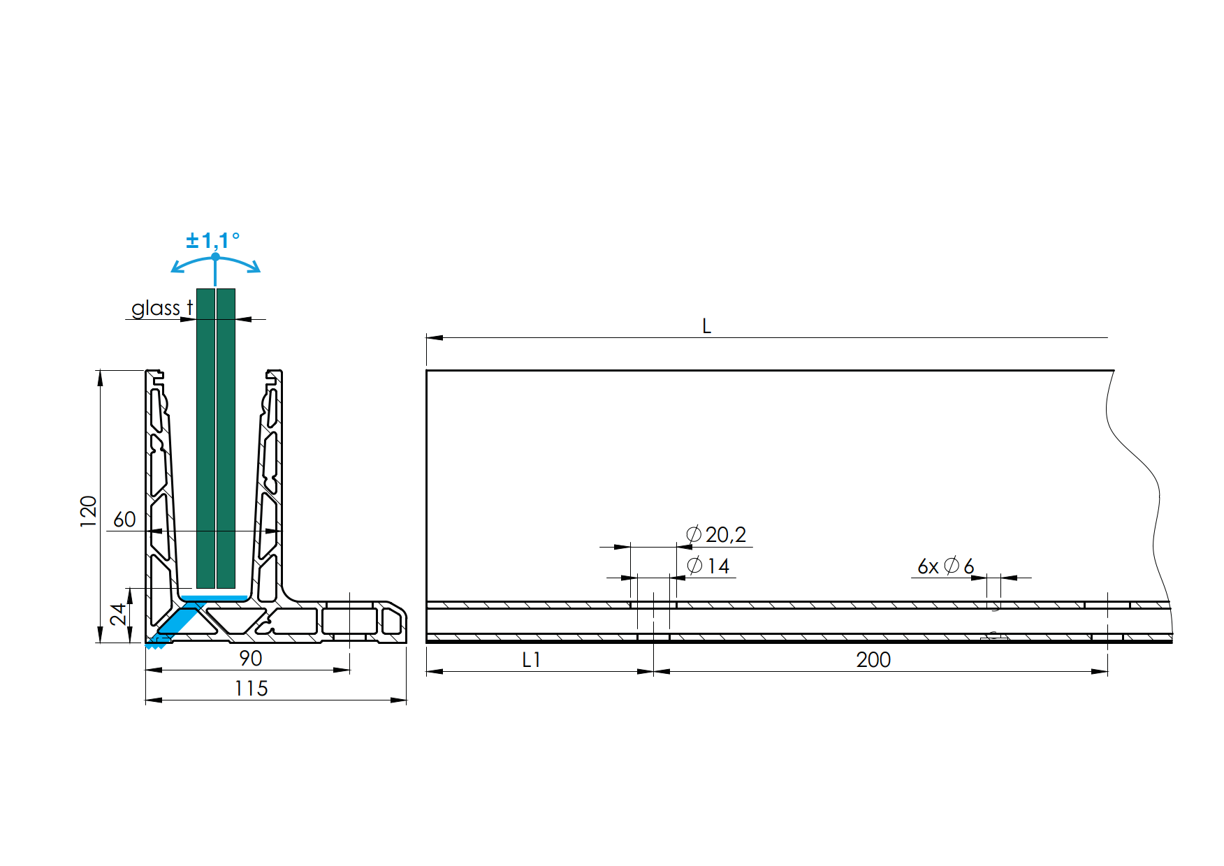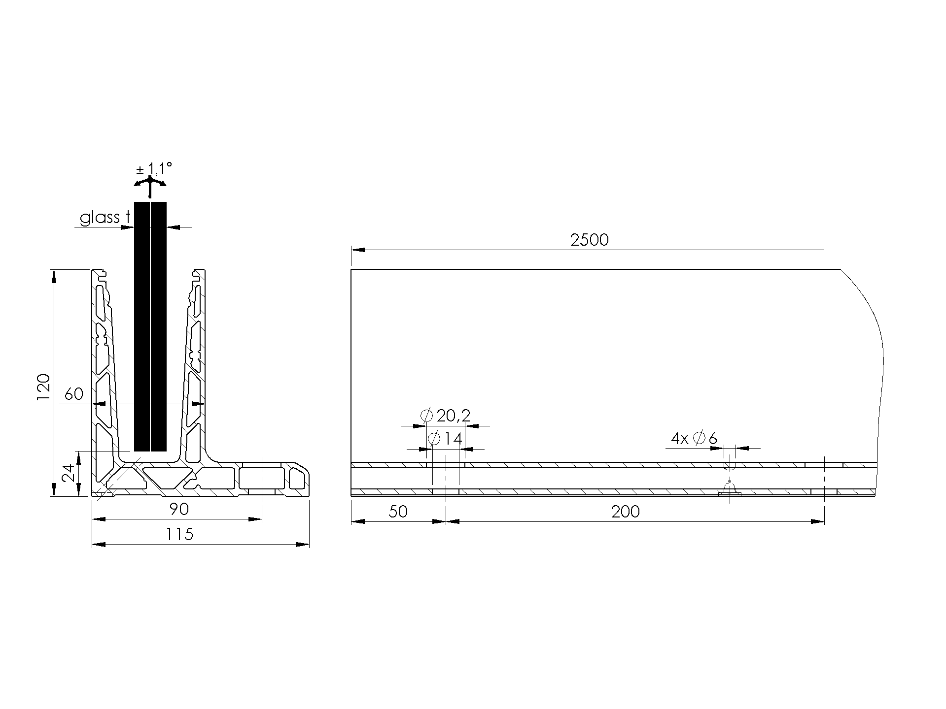 Al. kotviaci profil pre sklo T=12 až 17,52mm, kotvenie z vrchu do podlahy, nastaviteľný sklon skla. Dodávané v dĺžke L2500mm (13ks otvorov d14mm pre kotvenie). Dodávané bez tesnení.Povrchová úprava ELOX - brus.