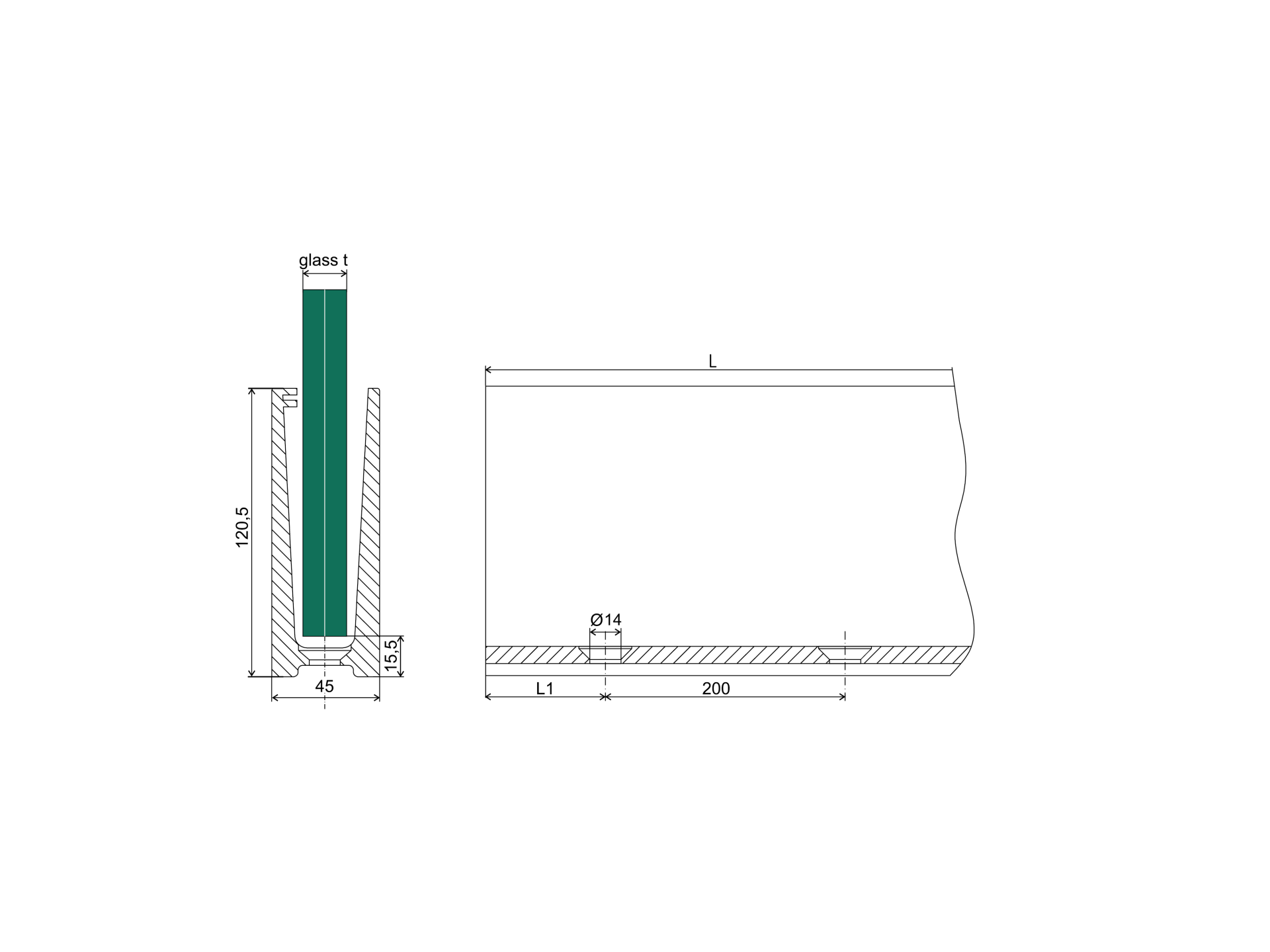 Materiál: Hliník, Povrchová úprava: Satin-INOX, Glass t: 12,00-21,52, L: 5000, Kotvenie: Zhora, L1: 100, G/h kN: 2,5
