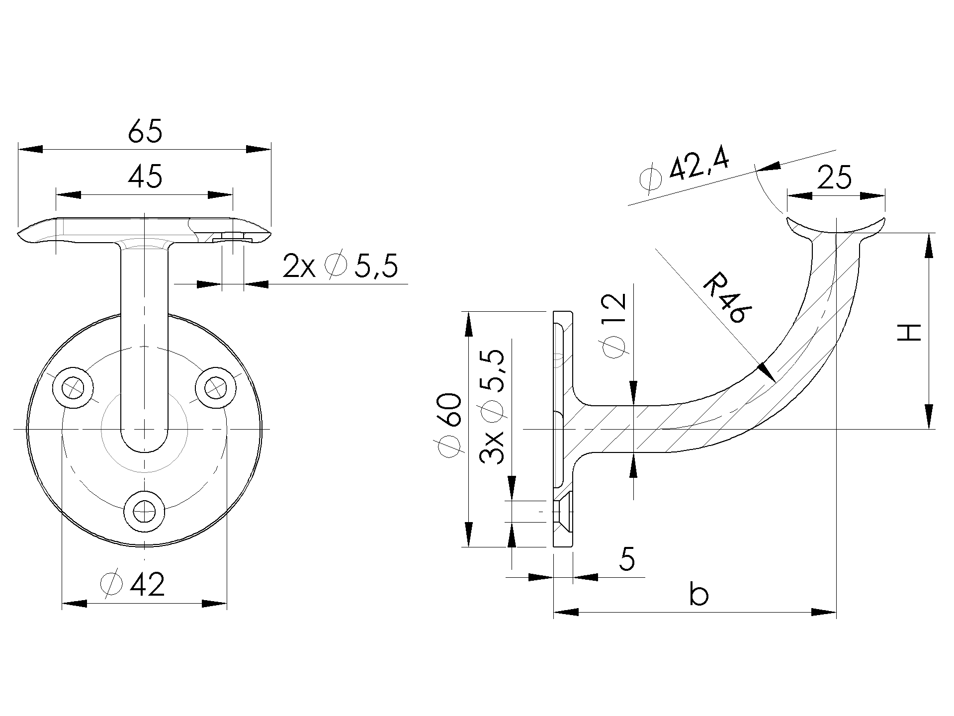 Materiál: Nerez AISI 304, Povrchová úprava: Brus, Madlo: D42,4, Kotvenie: Na stenu, b: 75, H: 50