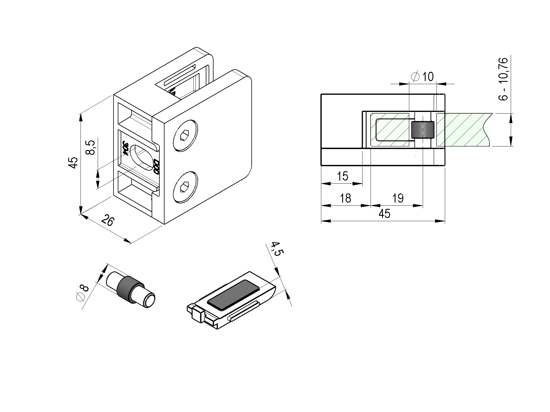 Držiak sklenenej (plechovej, tabuľovej) výplne je konštrukčný prvok používaný na upevnenie a stabilizáciu sklenenej alebo plechovej výplne v rôznych konštrukciách, ako sú zábradlia, balkóny alebo schodiská. Tento držiak zaisťuje pevné a bezpečné prichytenie výplne, čím zvyšuje celkovú stabilitu a bezpečnosť konštrukcie. Sú súčasťou moderných architektonických riešení, ktoré kombinujú funkčnosť, bezpečnosť a estetický vzhľad. Pri výbere držiaka je dôležité zvážiť jeho materiál, dizajn, funkčnosť a kompatibilitu s konkrétnou výplňou a celkovou konštrukciou. Držanie vyplne - poistenie voči vypadnutiu je dosiahnuté pomocou zverného spoja (doporučené použitie pri vrchnom kotveni) alebo zverny spoj + kolik (doporučené použitie pre bočne kotvenie) alebo zverny spoj + bezpečnostná platnicka (doporucene pouzitie pre bocne kotvenie). Držiak neobsahuje tesnenie (nutnost dokupit 2ks tesneni podla hrubky skla) a krytky pre skrutky.