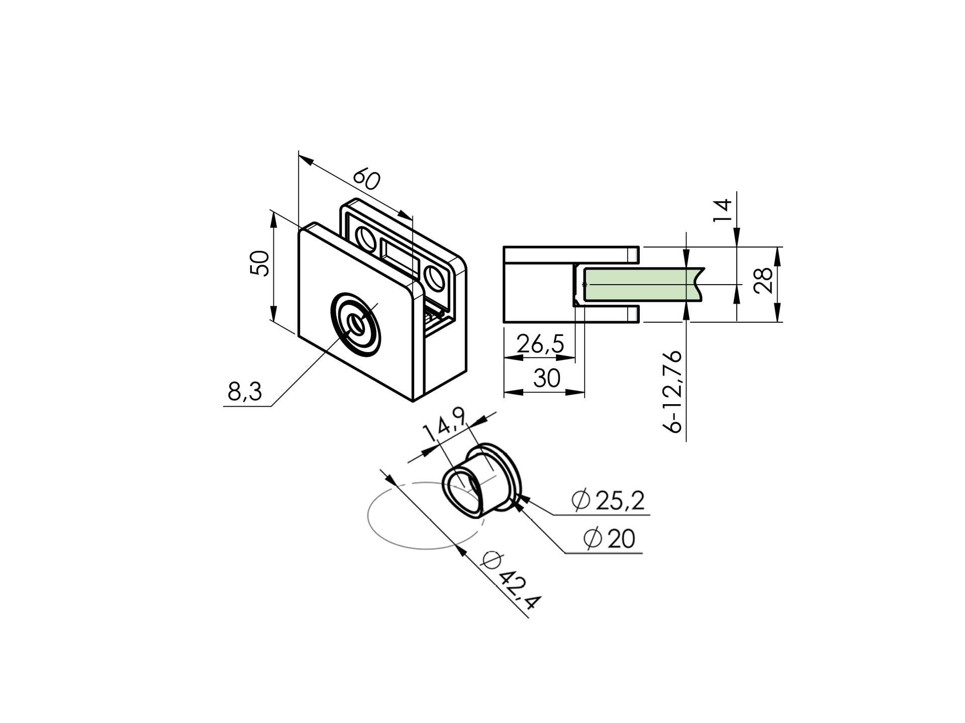 Uhlovo nastaviteľný jednostranny drziak výplne skla (plechu, tabuľovej vyplne). Držanie vyplne (poistenie voči vypadnutiu): zverny spoj (doporucene pouzitie pri vrchnom kotveni). Držiak neobsahuje tesnenie (nutnost dokupit 2ks tesneni podla hrubky skla) a krytky pre skrutky.