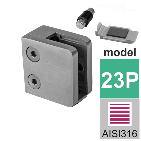 Držiak sklenenej (plechovej, tabuľovej) výplne je konštrukčný prvok používaný na upevnenie a stabilizáciu sklenenej alebo plechovej výplne v rôznych konštrukciách, ako sú zábradlia, balkóny alebo schodiská. Tento držiak zaisťuje pevné a bezpečné prichytenie výplne, čím zvyšuje celkovú stabilitu a bezpečnosť konštrukcie. Sú súčasťou moderných architektonických riešení, ktoré kombinujú funkčnosť, bezpečnosť a estetický vzhľad. Pri výbere držiaka je dôležité zvážiť jeho materiál, dizajn, funkčnosť a kompatibilitu s konkrétnou výplňou a celkovou konštrukciou. Držanie vyplne - poistenie voči vypadnutiu je dosiahnuté pomocou zverného spoja (doporučené použitie pri vrchnom kotveni) alebo zverny spoj + kolik (doporučené použitie pre bočne kotvenie) alebo zverny spoj + bezpečnostná platnicka (doporucene pouzitie pre bocne kotvenie). Držiak neobsahuje tesnenie (nutnost dokupit 2ks tesneni podla hrubky skla) a krytky pre skrutky.