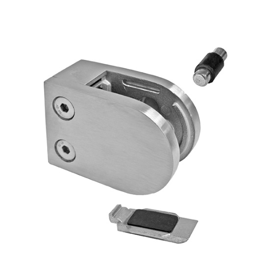 Držiak sklenenej (plechovej, tabuľovej) výplne je konštrukčný prvok používaný na upevnenie a stabilizáciu sklenenej alebo plechovej výplne v rôznych konštrukciách, ako sú zábradlia, balkóny alebo schodiská. Tento držiak zaisťuje pevné a bezpečné prichytenie výplne, čím zvyšuje celkovú stabilitu a bezpečnosť konštrukcie. Sú súčasťou moderných architektonických riešení, ktoré kombinujú funkčnosť, bezpečnosť a estetický vzhľad. Pri výbere držiaka je dôležité zvážiť jeho materiál, dizajn, funkčnosť a kompatibilitu s konkrétnou výplňou a celkovou konštrukciou. Držanie vyplne - poistenie voči vypadnutiu je dosiahnuté pomocou zverného spoja (doporučené použitie pri vrchnom kotveni) alebo zverny spoj + kolik (doporučené použitie pre bočne kotvenie) alebo zverny spoj + bezpečnostná platnicka (doporucene pouzitie pre bocne kotvenie). Držiak neobsahuje tesnenie (nutnost dokupit 2ks tesneni podla hrubky skla) a krytky pre skrutky.