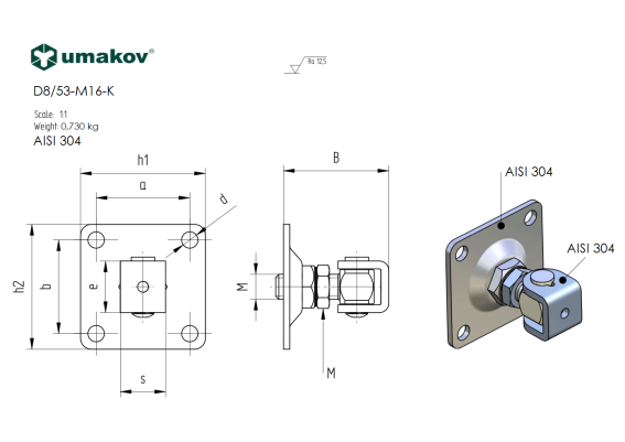 Materiál: Nerez AISI 304, Povrchová úprava: Natural, Hmotnosť brány Gmax/Goptimal (kg): 60, e: 36, h1: 80, h2: 80, M: 16, s: 30, a: 55, B: 64-80, b: 55