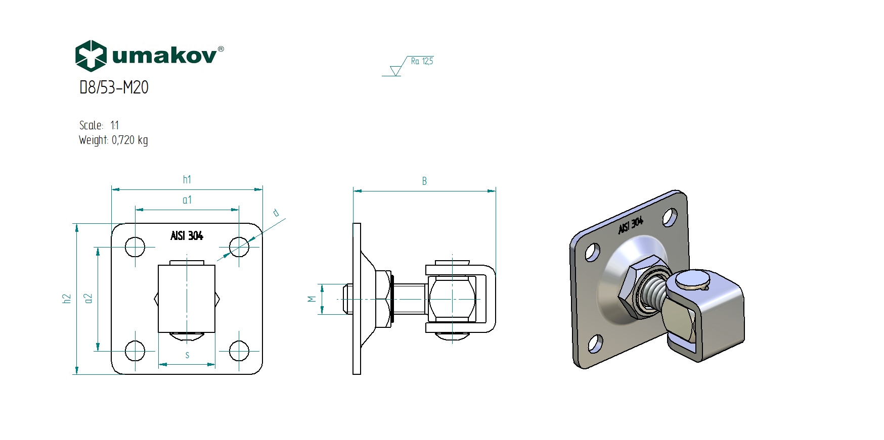 Materiál: Nerez AISI 304, Povrchová úprava: Natural, Hmotnosť brány Gmax/Goptimal (kg): 100, d: 10,5, e: 35, h1: 100, h2: 100, M: 20, s: 30, a: 75, B: 60-90, b: 75