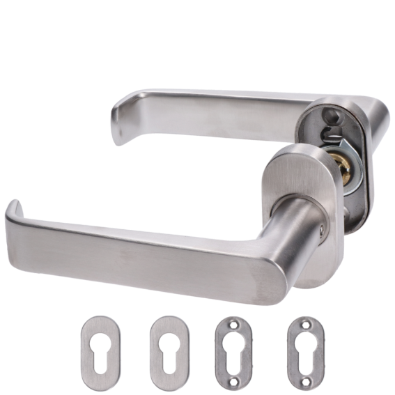 Kľučka so štítkom na cylindrickú vložku - 1pár - brusený nerez, možnosť otočenia pružinového vratného mechanizmu pre zmenu smeru otvárania