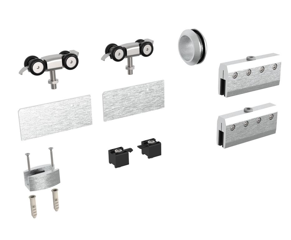 Sada pre sklenené posuvné dvere v lište , sada obsahuje 2x vozík horný s držiakom skla , profil horný AL -2000mm ,krycia lišta -2000mm ,2x záslepka,2x doraz ,vodítko,montážny kľúč.1x madlo (montážny otvor 48mm)