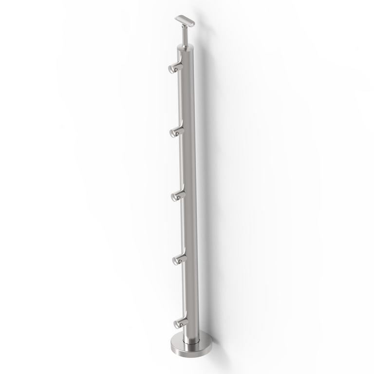 nerezový stĺpik D42,4mm pre madlo D42,4mm, vrchné kotvenie, materiál AISI 304 brus K320, horizontálna výplň 5 x d12 mm. Určené pre rovné zábradlie výšky 110 cm, pre montáž s max. prepadom do 30 m. Možnosť nastavenia sklonu výplne a madla.