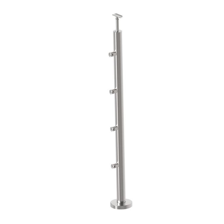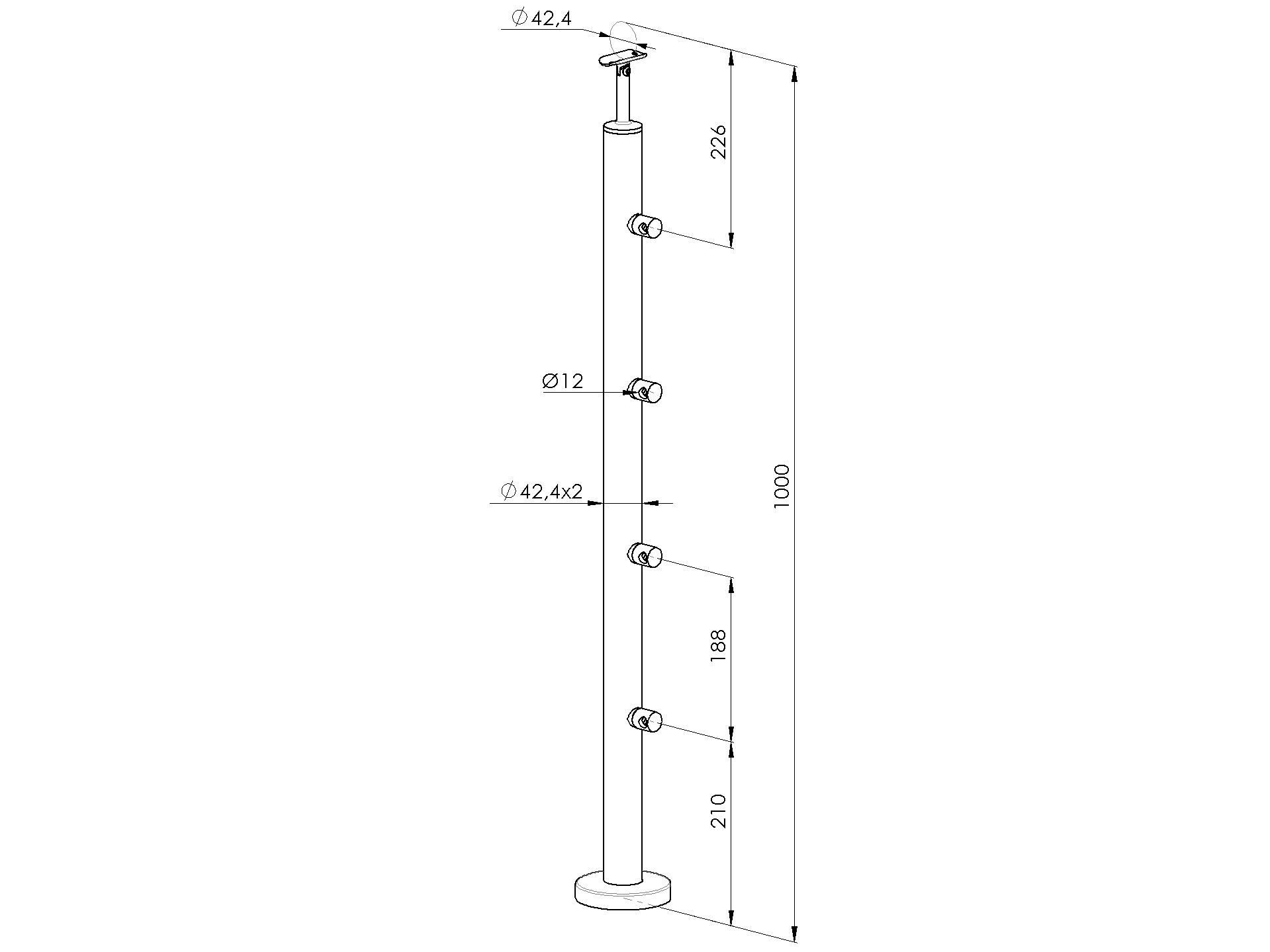 Nerezový stĺpik D42,4 mm pre madlo D42,4 mm. Vrchné kotvenie. Horizontálna výplň 4 x d12 mm. Určené pre schodiskové zábradlie výšky 90 cm, pre montáž s max. prepadom do 3 m. Možnosť nastavenia sklonu výplne a madla.