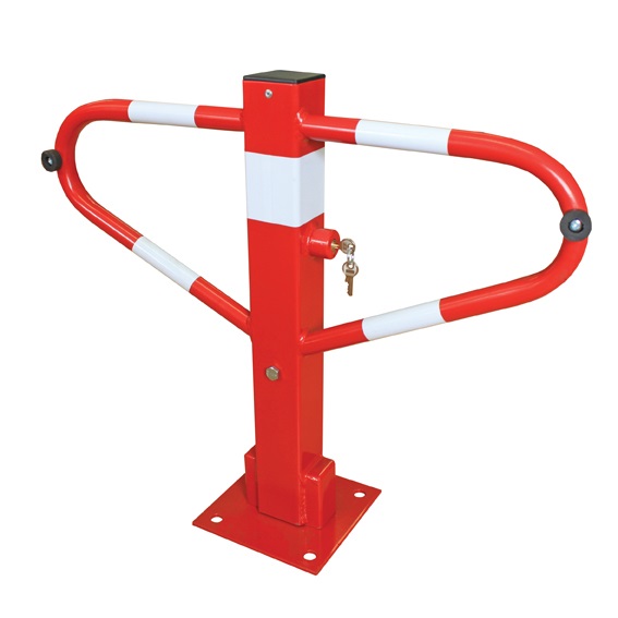Manuálna závora parkovacieho miesta, vyrobená z oceľovej rúry, práškovo lakovaná červenou reflexnou farbou, navyše označená bielymi reflexnými nálepkami.