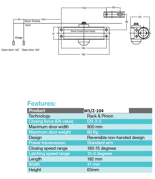 Samozatvárač s plynulým nastavením zatvárania 180°-15°a15°-0°, rozmery 182x41x63mm. Maximálna šírka dverí 900mm , váha dverí do 60kg.