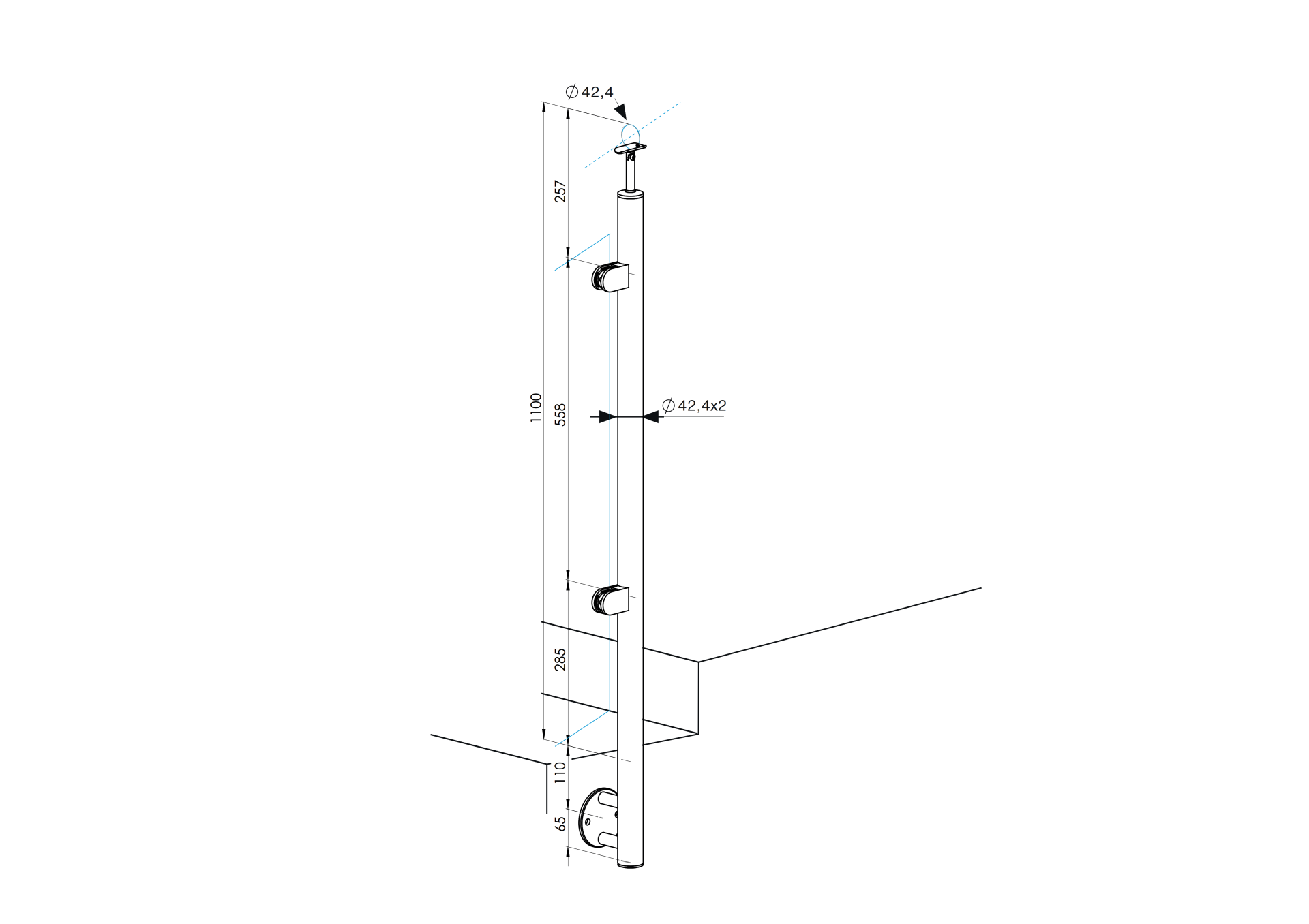 Materiál: Nerez AISI 304, Povrchová úprava: Brus, Použitie: Schody/1000mm, Výplň: Sklo, Glass t: 8,76, Stĺpik: D42,4x2, L: 1100, Madlo: D42,4x2, Kotvenie: Z boku, h1: 285, h2: 558, h3: 257, h4: 110, h5: 65