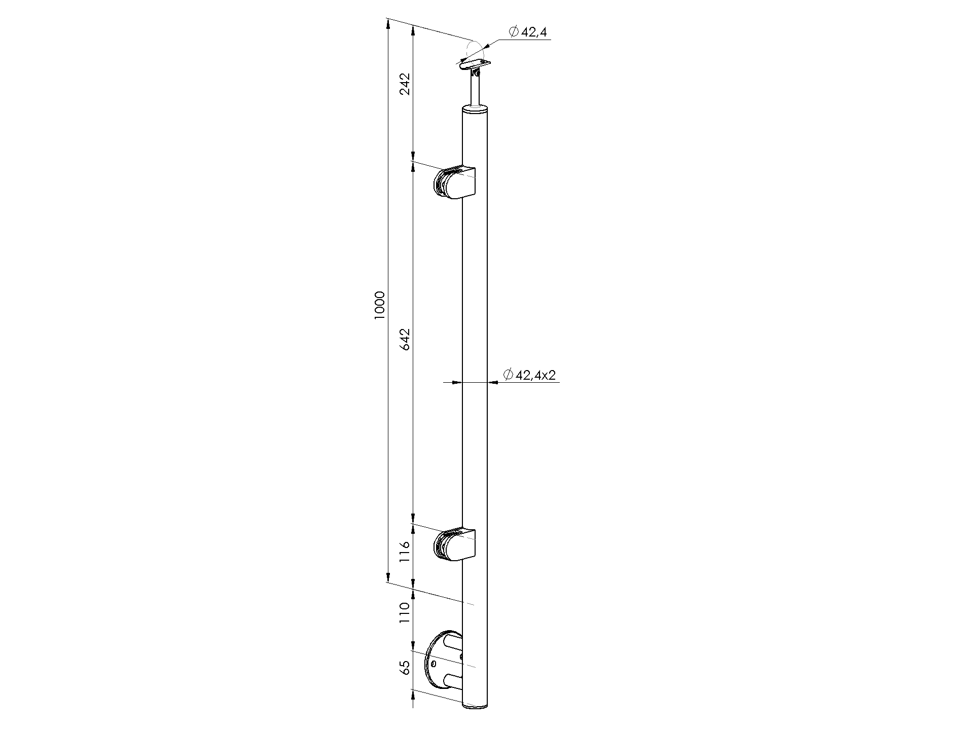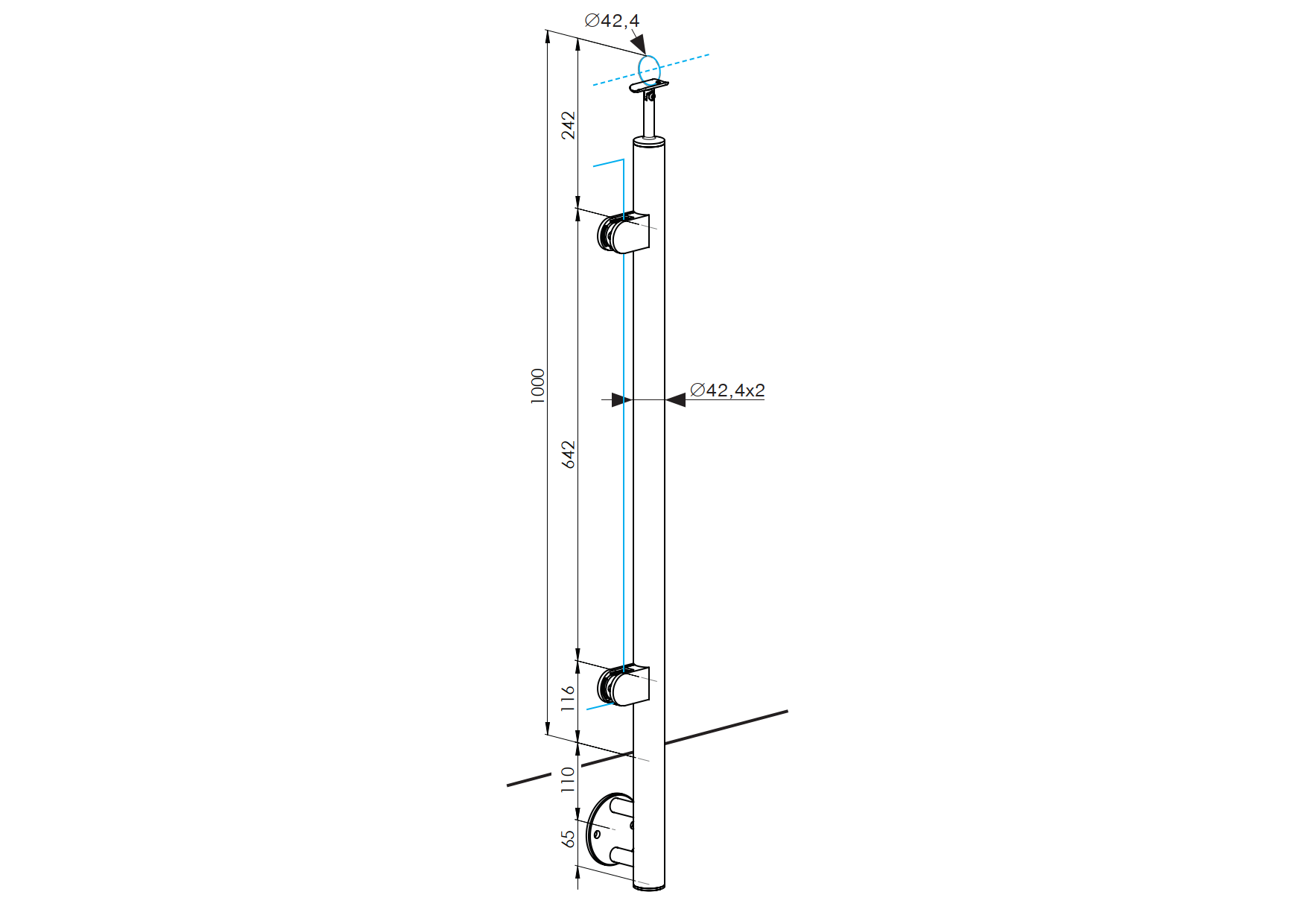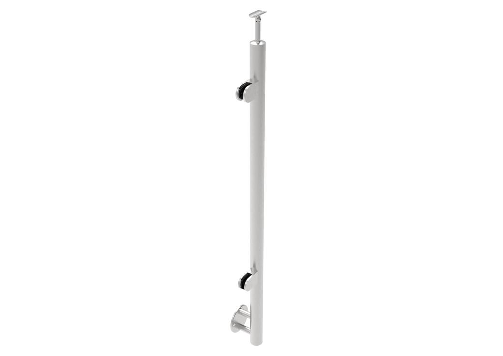 nerezový stĺpik D42,4mm pre madlo D42,4mm, bočné kotvenie, materiál AISI 304 brus K320, sklenená výplň. Možnosť nastavenia sklonu výplne a madla.