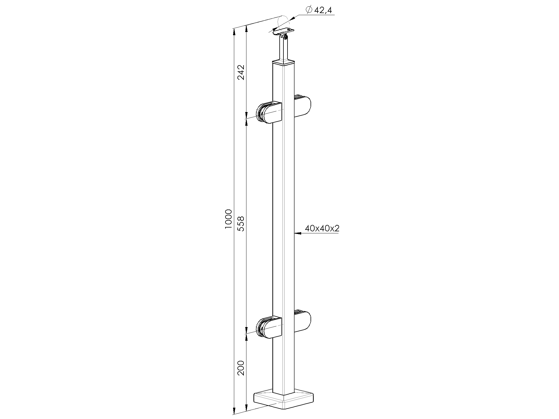 Nerezový jaklový stĺpik s navarenou kotviacou prírubou a krycou rozetou. Súčasťou stĺpika je nastaviteľný držiak madla a držiaky skla (pre sklo hrúbky 8,76 mm). Používa sa na zhotovenie 1000 mm vysokého zábradlia zo sklom ako vnútorný stĺpik. Kotviaci materiál nie je súčasťou.