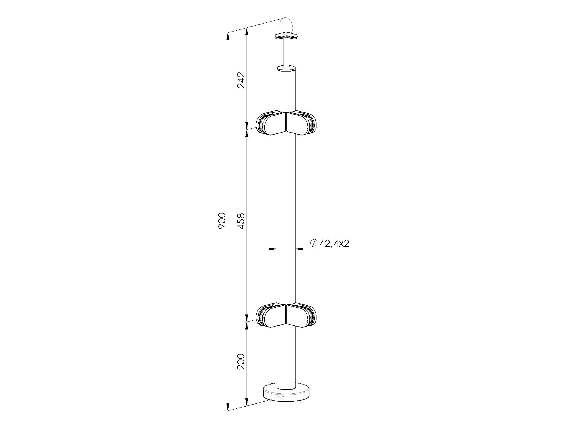 Materiál: Nerez AISI 304, Povrchová úprava: Brus, Použitie: Rovina/900mm, Glass t: 8,76, L: 900, Kotvenie: Zhora, h1: 200, h2: 458, h3: 242