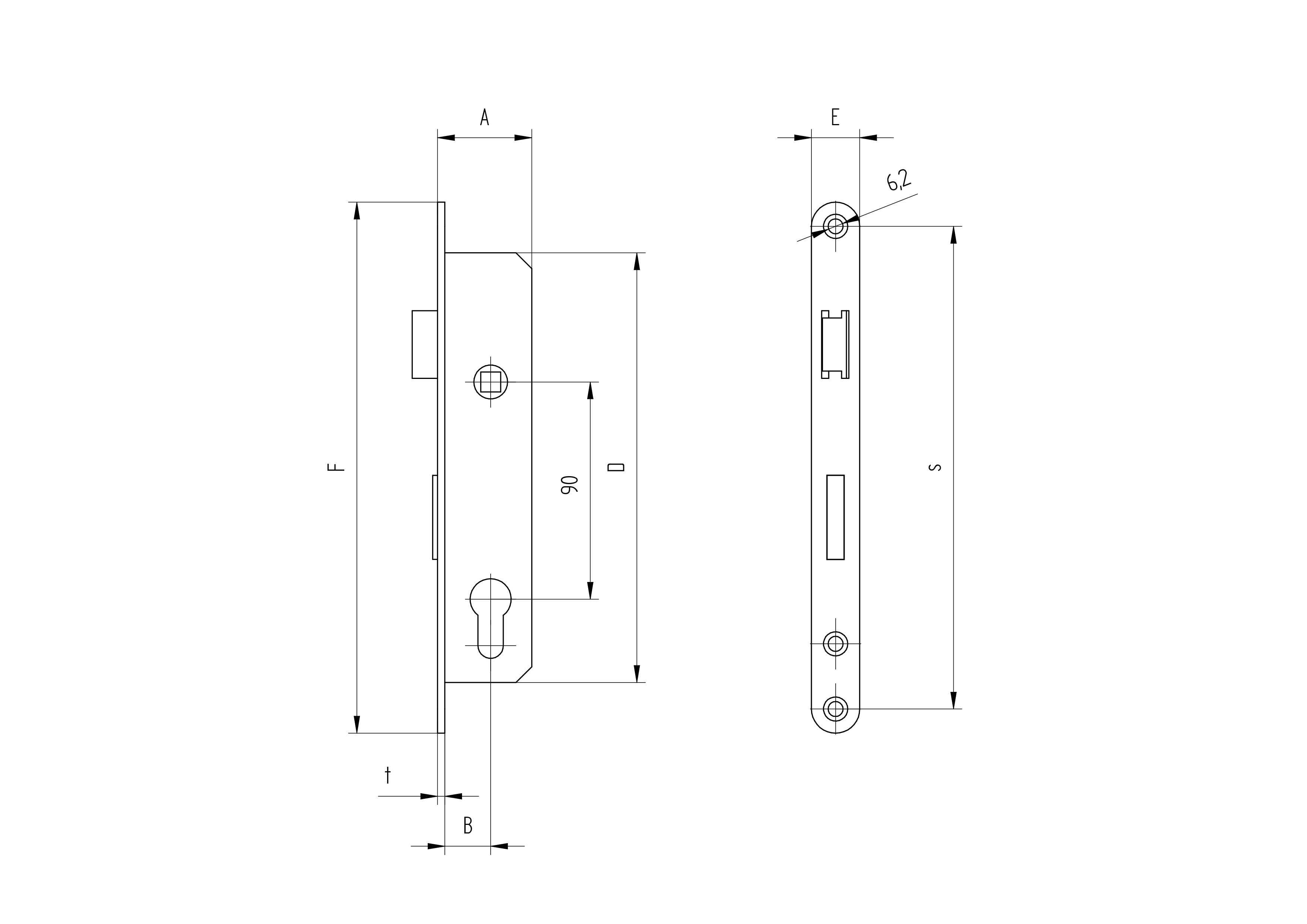 Materiál: Nerez AISI 304, Povrchová úprava: Brus, Značka: Hobes, Osový rozostup: 90mm, s: 210, t: 2,5, A: 40, E: 22, F: 240, B: 22,5, D: 180