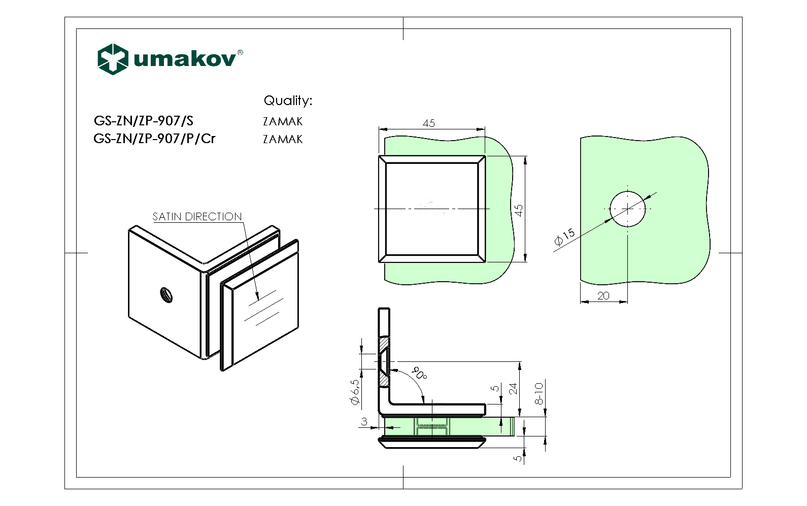 Zasklenie pevne - držiak skla, 90°,Zamak,T 8-10mm