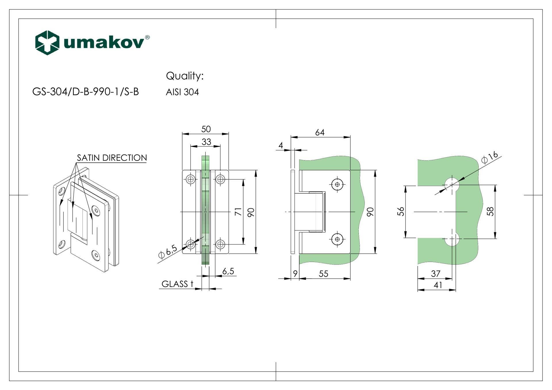 Materiál: Nerez AISI 304, Povrchová úprava: Brus, Glass t: 8, 10, Výplň: Sklo, Gmax(kg)/2pcs: 45, Kotvenie: Na stenu, Funkcia samozatvárania: +-15°, Funkcia stop: +-90°/0°, Otvor v skle: Áno