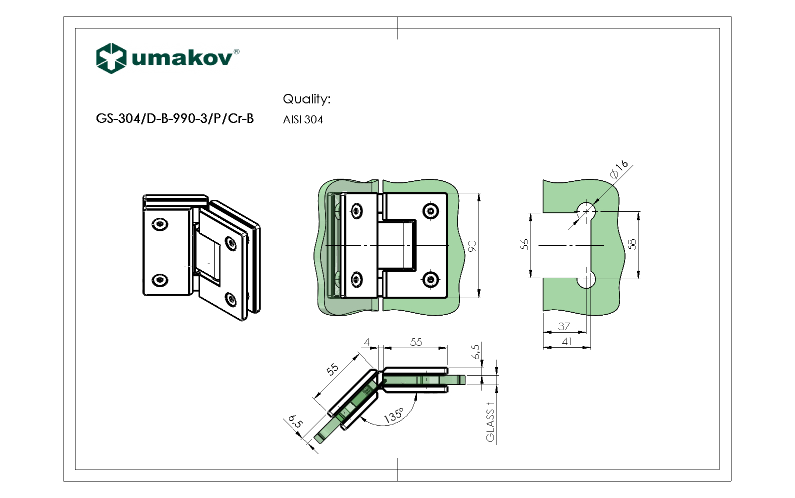 Materiál: Nerez AISI 304, Povrchová úprava: Lesk, Glass t: 8-10, Výplň: Sklo, Gmax(kg)/2pcs: 45, Kotvenie: Na sklo, Funkcia samozatvárania: +-15°, Funkcia stop: +-90°/0°, h: 90, b: 55, Otvor v skle: Áno