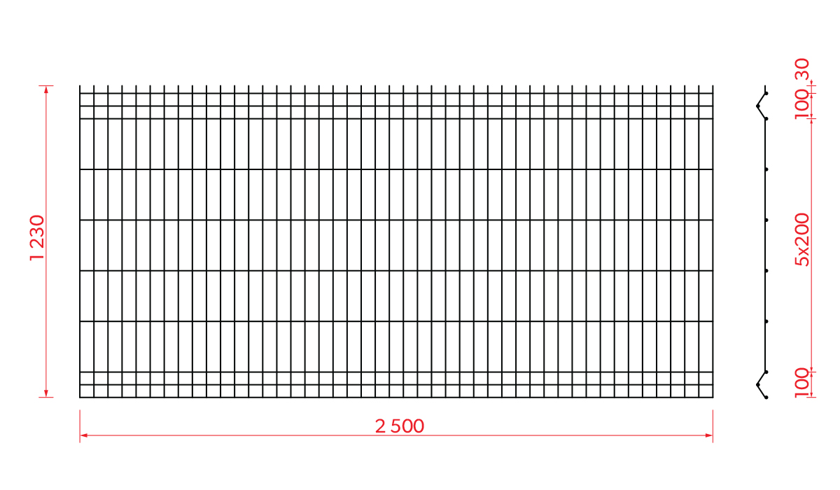 Zvárané panely dodávame v štandardných rozmeroch so šírkou 2500 mm a výškou 830 mm, 1030 mm, 1230 mm, 1530 mm, 1730 mm a 2030 mm. Hrúbka pozinkovaného a poplastovaného drôtu je 4 mm.