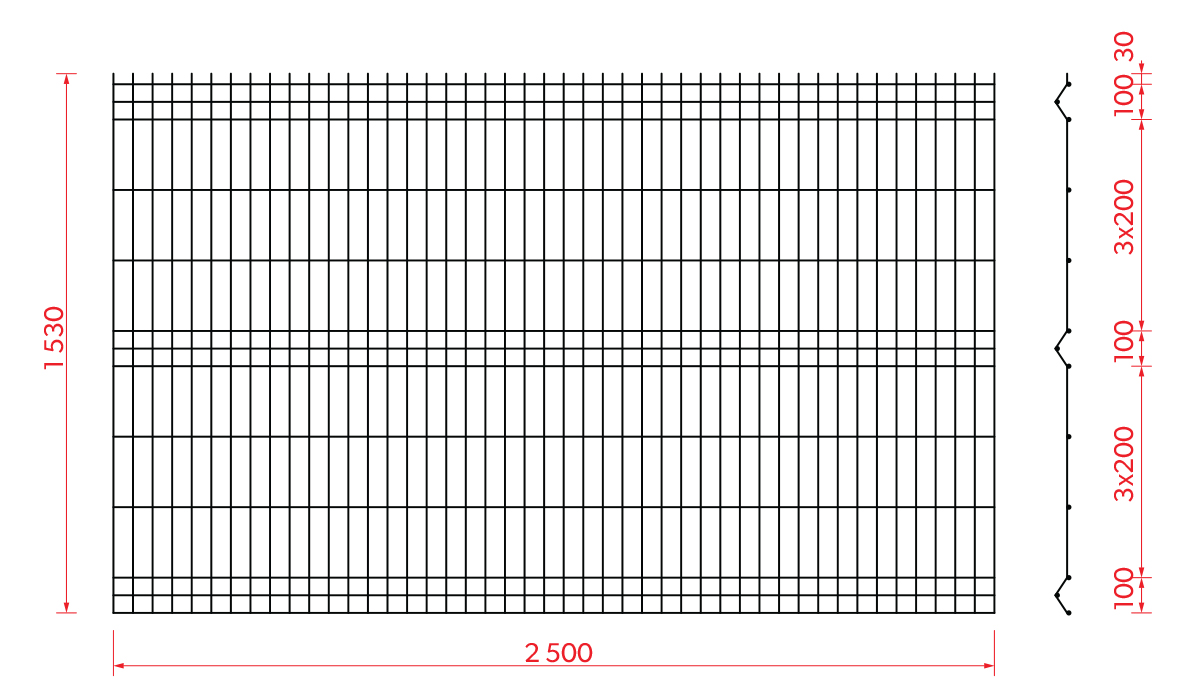 Zvárané panely dodávame v štandardných rozmeroch so šírkou 2500 mm a výškou 830 mm, 1030 mm, 1230 mm, 1530 mm, 1730 mm a 2030 mm. Hrúbka pozinkovaného a poplastovaného drôtu je 4 mm.
