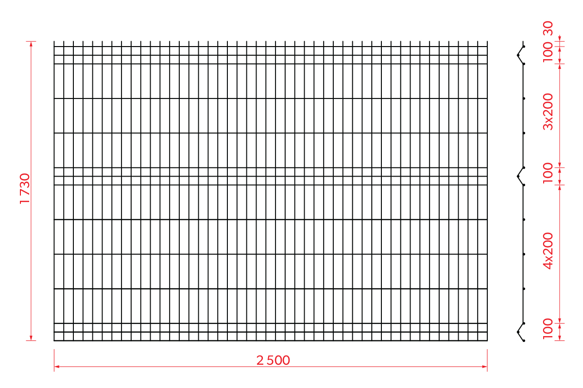 Zvárané panely dodávame v štandardných rozmeroch so šírkou 2500 mm a výškou 830 mm, 1030 mm, 1230 mm, 1530 mm, 1730 mm a 2030 mm. Hrúbka pozinkovaného a poplastovaného drôtu je 4 mm.