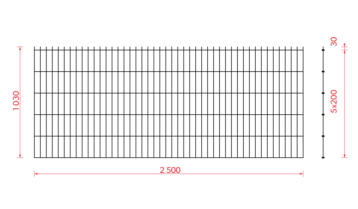 Zvárané panely dodávame v štandardných rozmeroch so šírkou 2500 mm a výškou 830 mm, 1030 mm, 1230 mm, 1430 mm, 1830 mm a 2030 mm. Hrúbka pozinkovaného a poplastovaného dvojitého horizontálneho drôtu je 5mm. Hrúbka vertikálneho drôtu je 4 mm.
