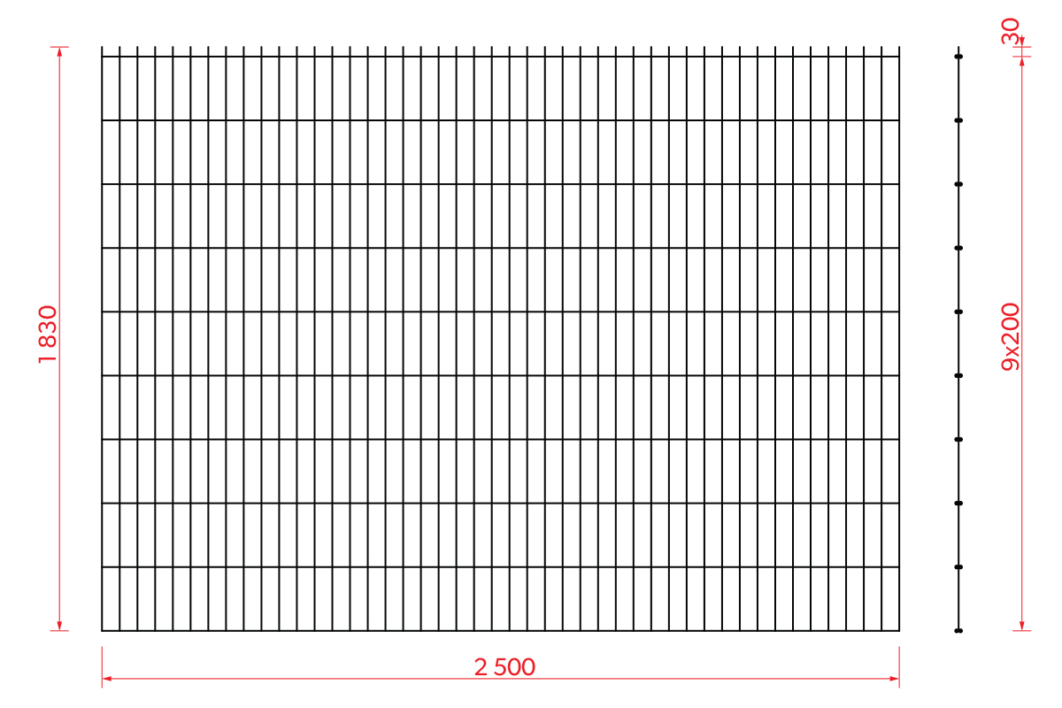 Zvárané panely dodávame v štandardných rozmeroch so šírkou 2500 mm a výškou 830 mm, 1030 mm, 1230 mm, 1430 mm, 1830 mm a 2030 mm. Hrúbka pozinkovaného a poplastovaného dvojitého horizontálneho drôtu je 5mm. Hrúbka vertikálneho drôtu je 4 mm.