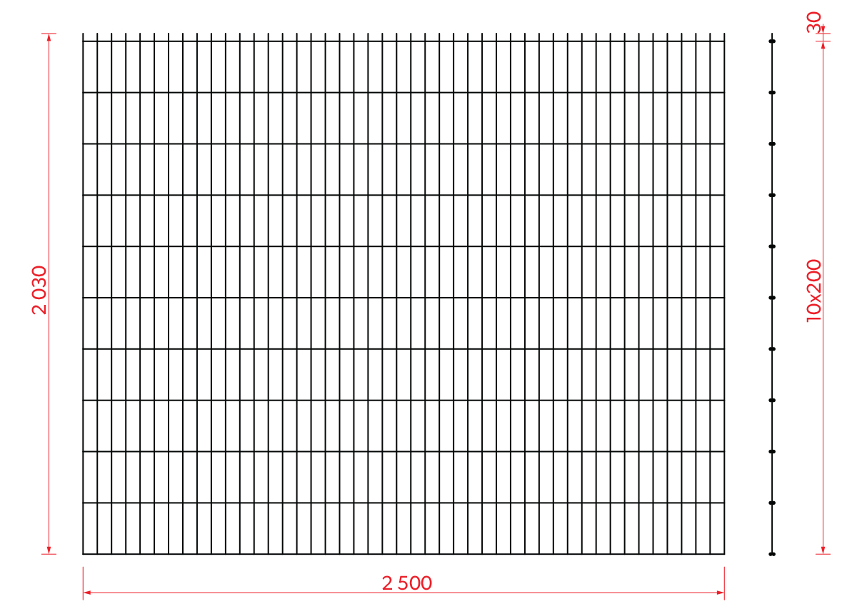 Zvárané panely dodávame v štandardných rozmeroch so šírkou 2500 mm a výškou 830 mm, 1030 mm, 1230 mm, 1430 mm, 1830 mm a 2030 mm. Hrúbka pozinkovaného a poplastovaného dvojitého horizontálneho drôtu je 5mm. Hrúbka vertikálneho drôtu je 4 mm.