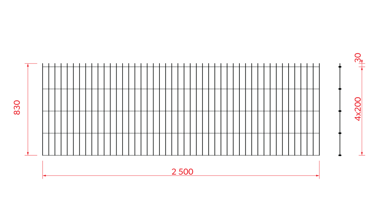 Zvárané panely dodávame v štandardných rozmeroch so šírkou 2500 mm a výškou 830 mm, 1030 mm, 1230 mm, 1430 mm, 1830 mm a 2030 mm. Hrúbka pozinkovaného a poplastovaného dvojitého horizontálneho drôtu je 5mm. Hrúbka vertikálneho drôtu je 4 mm.